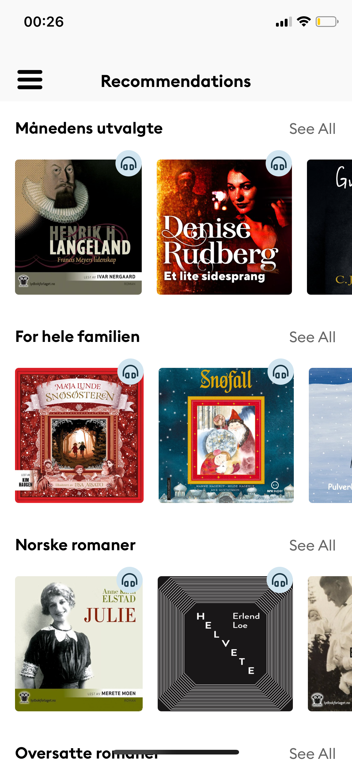 Med smarte algoritmer vil appen hjelpe deg til å finne lydbøker mange sjangre og kategorier. I appen kan du enkelt markere lydbøker du ønsker å høre på slik at du har god oversikt over dine favoritter. Du kan også laste ned lydbøker offline slik at du kan lytte på dem når du ikke har nett. Liker du å høre på lydbøker før du legger deg kan du sette på en sove-funksjon slik lydboken slår seg av når du sovner. Som med fysiske bøker kan du også legge inn dine egne bokmerker.